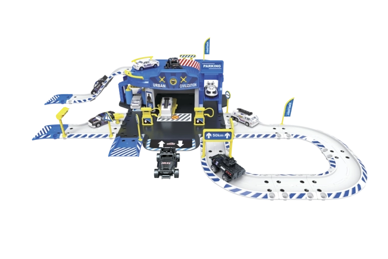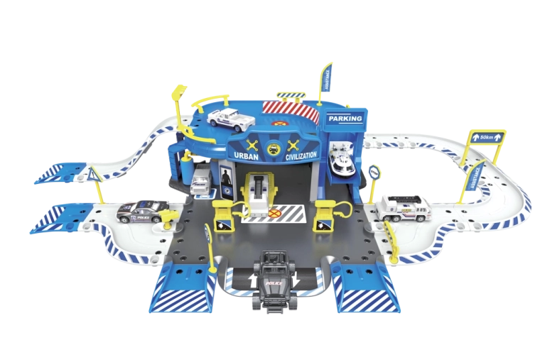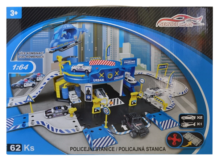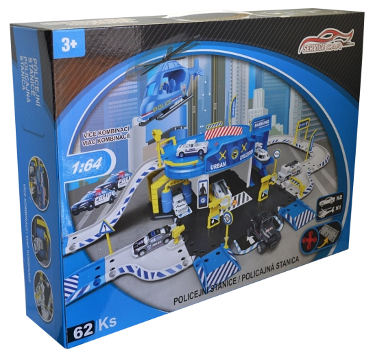 Rendőrségi állomás garázs tartozékokkal (62 darabos készlet) A garázs mérete összeszerelve: 83,2 × 45,2 × 20 cm A készlet tartalma: rendőrállomás garázzsal, 1:64 méretarányú fém kisautó (6 db) és helikopter