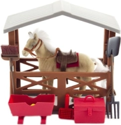 Fedezd fel a farm varázsát ezzel a valósághű készlettel a kis lórajongóknak. A csomag tartalma: műanyag ló puha plüsshatású felülettel, nyereg és kantár, praktikus istálló és gazdag ápolási kiegészítők a játékhoz. Ideális kreatív és képzeletbeli játékhoz 3 éves kortól.