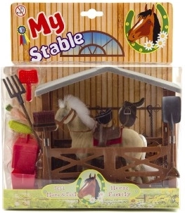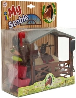 - Ló nyereggel és kantárral, istálló, vödör, seprű, villa, lapát, felszereléses kis bőrönd