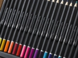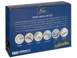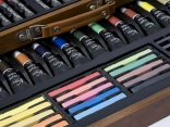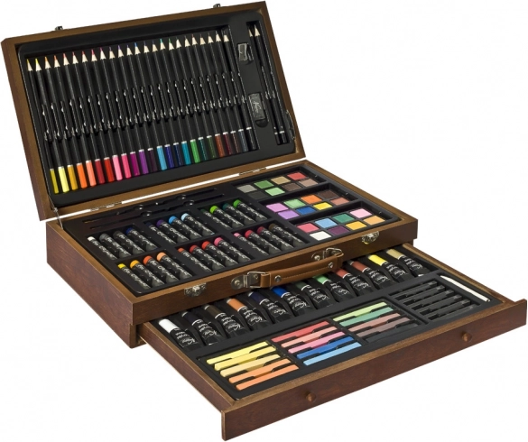 Festőkészlet fa kofferben – a fa, kihajtható koffer mindent tartalmaz a festők számára – színes kréták, ceruzák, festékek, hegyező, radír, ecsetek stb., összesen 112 db.