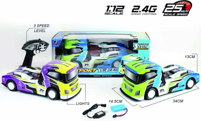 Modern R/C versenykamion 1:12 méretarányban, három sebességmóddal egészen 25 km/h-ig, első LED fényszórókkal, mindkét tengelyen lengéscsillapítókkal és realista megjelenéssel. Stabil 2,4 GHz-es irányítás, USB-s töltés, és minden megtalálható a dobozban a vezetéshez – csak az adó elemeit kell külön megvásárolni.