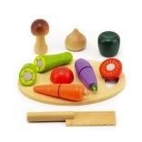 Zöldségszeletelő készlet gyerekeknek, amely 16 fa részből áll, ideális a motoros készségek fejlesztéséhez. Az egyes gyümölcsdarabok tépőzárral vannak összekapcsolva.