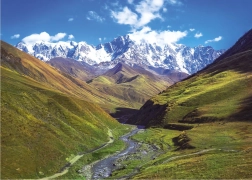 - Szkara (Usba) hegy, kaukázusi táj folyóval és havas csúcsokkal