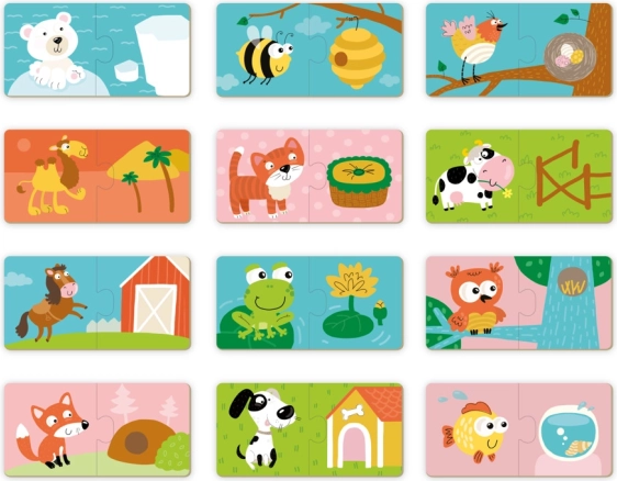 Fedezd fel az első kirakókat a legkisebbeknek: a készlet 12 párost tartalmaz, amelyekben a gyerekek az állatot a saját otthonával párosítják. A nagy és masszív elemek kb. 3 mm-es vastagsággal megkönnyítik a fogást és az összerakást, miközben fejlesztik a finommotorikát és a logikus gondolkodást.