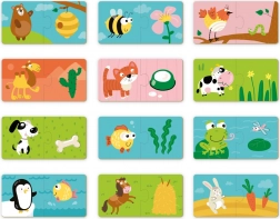 A „Mit esznek az állatok?” gyerekpuzzle megtanítja a legkisebbeknek helyesen párosítani az állatokat a kedvenc finomságaikkal. A 12 egyszerű párosító készletnek köszönhetően a gyerekek gyakorolják a megfigyelést, a koncentrációt és a kéz–szem koordinációt, miközben játékos formában új fogalmakat tanulnak.