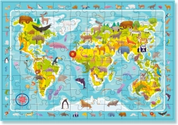 Ez az oktató puzzle a világ minden tájáról származó állatokkal szórakoztató tanulási formát kínál 5 éves kortól. A feltűnő színeknek és az áttekinthető illusztrációknak köszönhetően a gyerekek könnyen megjegyzik az egyes fajokat és elterjedésüket. Az összeállítás után folytathatják a Keresd meg és találd meg játékkal, amely fejleszti a tájékozódást és a földrajzi ismereteket.