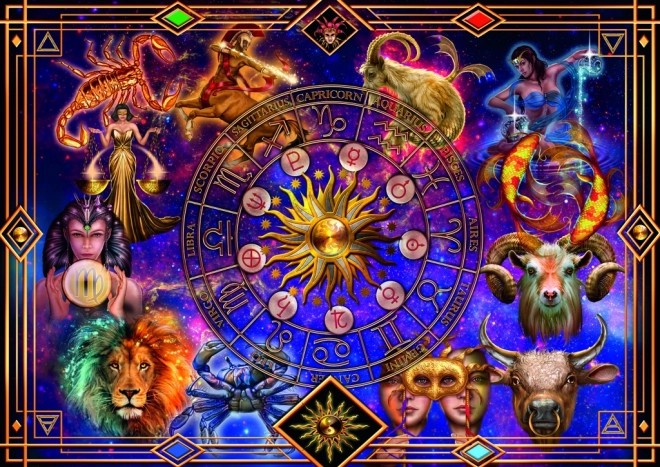 A színes kompozíció az állatövi jegyek teljes skáláját mutatja be misztikus kozmikus palettán – tökéletes az asztrológia rajongóinak.