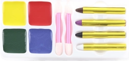 Ez az arc- és testfestő készlet mindent kínál a gyors és látványos átalakuláshoz. A 4 krémes festék és a 4 színes ceruza kombinációjával precíz vonalakat, finom árnyékolást és feltűnő motívumokat hozhatsz létre. A festékek a mellékelt applikátorokkal könnyen felvihetők, nagyobb felületekre szivacs is használható.