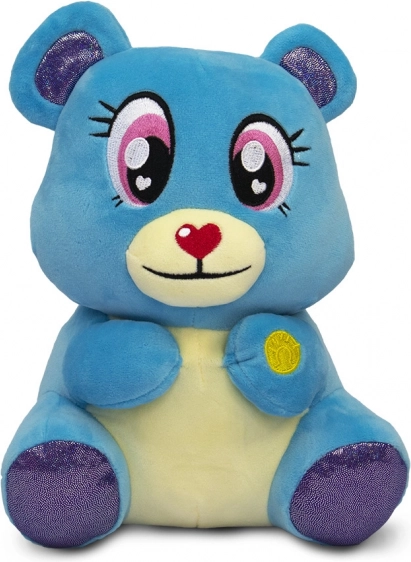 A medve nagy hímzett szemekkel és szív alakú orral rendelkezik, fülei és mancsai csillogó lila anyagból készültek.