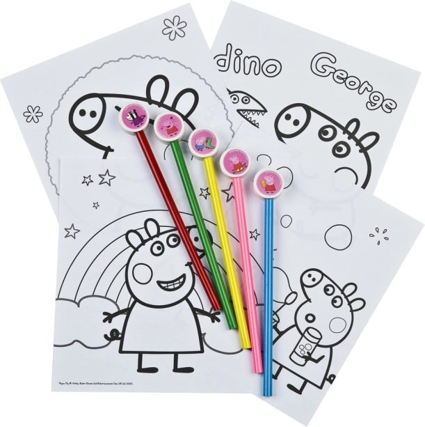 - 24 poszter Peppa Malac motívumokkal, amelyeket a gyerekek kedvük szerint kiszínezhetnek.