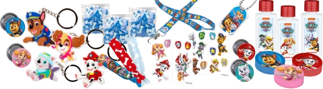 3 hajpánt, 1 kulcstartó, 4 kulcsdísz, 4 jelvény, 4 kutyabiléta, 1 testápoló tej, 1 tusfürdő, 2 matrica készlet, 3 konfetti csomag, 3 pezsgőfürdő