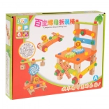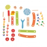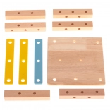 A csomagban fa csavarhúzó, kulcs, csavarok és anyák találhatók – a gyerekek megtanulják helyesen összekapcsolni az elemeket, és fejlesztik a finommotorikát.