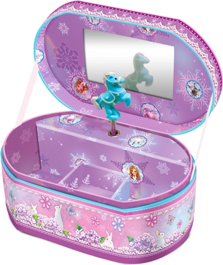 Ez az ovális zenei ékszerdoboz mesés stílusban varázst és rendet visz a gyerekszobába. A fedél felnyitásakor automatikusan megszólal egy lágy zenei dallam, amely örömteli pillanatot teremt a gyűrűk, fülbevalók és apró kincsek elhelyezésekor.