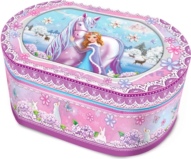 Bűvöld el a kis hercegnőt egy elegáns ékszerdobozzal ló és hercegnő mesés motívummal. Kinyitáskor egy gyönyörű dallam csendül fel, amely elkíséri a kincsek elhelyezését. A bőséges férőhelynek, a strapabíró kivitelnek és a biztonságos megmunkálásnak köszönhetően ideális választás az első ékszerek és apróságok számára.