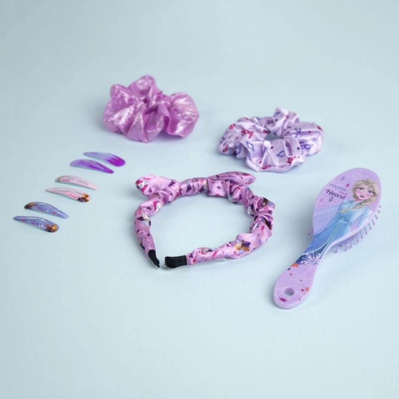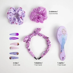 A csomag mindent tartalmaz, amire egy kis hölgynek szüksége lehet: 6 díszített fém csatot a tincsek könnyű rögzítéséhez, masnis hajpántot a frizura finom megtartásához, hajkefét a fájdalommentes kifésüléshez és 2 szatén hajgumit, amelyek kíméletesek a hajhoz.