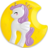 A doboz egyszarvú alakban, arany koronával tervezték, ami játékosságot és stílust kölcsönöz.