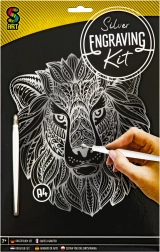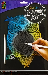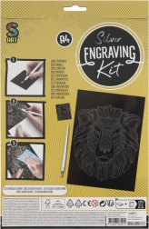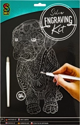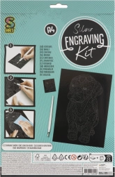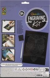 A csomag mindent tartalmaz: 25 × 20 cm-es kép, fémhegyű műanyag kaparó toll és próbakártya a vonások és textúrák gyakorlásához.