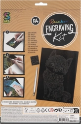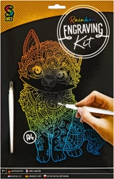 A fekete fedőréteg kaparás közben élénk, szivárványos színekre vált. Részletgazdag macska-motívumot készíthetsz festékek és ragasztók nélkül – elég a mellékelt toll.