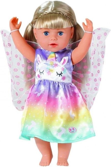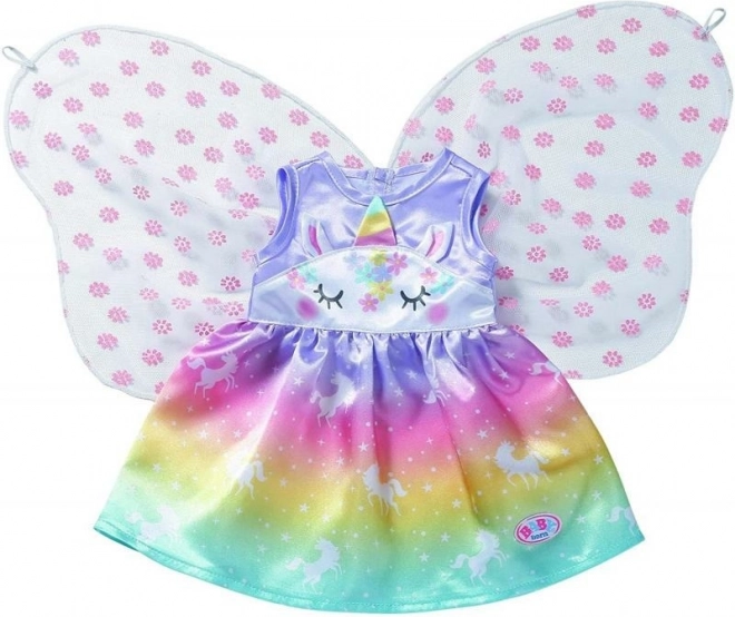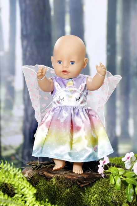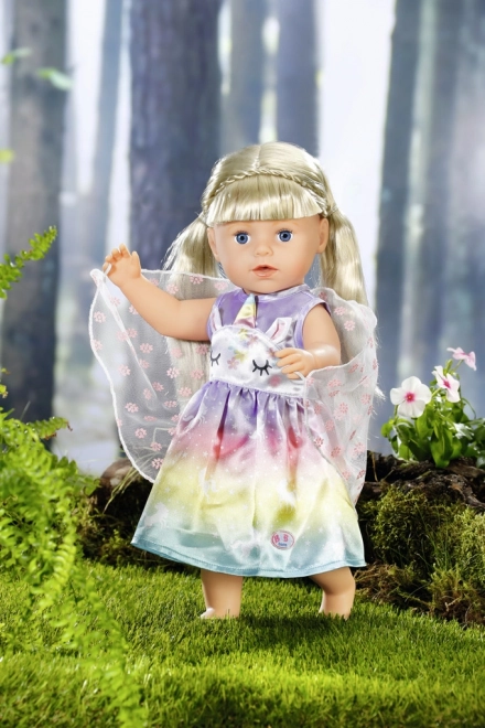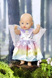 A tündérek és az egyszarvúk úgy tartoznak össze, mint a tej és a keksz. A BABY born babaruhája csodaszép, szivárványos anyagból készült. A szoknya varázslatos, a csillagos égbolton táncoló egyszarvúakkal van mintázva. A ruha felső része elöl egy egyszarvú arcával díszített, felvarrt fülecskékkel és színes szarvval. Egy igazi tündérnek természetesen szárnyakra is szüksége van. Az áttetsző, csillogó virágokkal díszített szárnyak a ruha hátsó részébe vannak bevarrva, és amint a BABY born a felső részen található kis nyíláson átdugja a kezét, a szárnyak kinyílnak. Eredeti BABY born babaruha. Kreatív, változatos és hosszan tartó játékhoz. BABY born Tündérmese jelmez – Egyszarvú, 43 cm-es babákhoz. Vállfa tartozék.