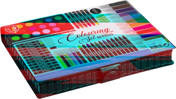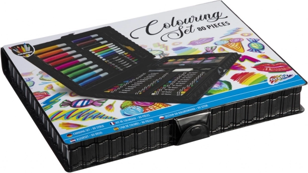 A készlet széles választékban tartalmaz művészeti kellékeket különböző technikákhoz és kifejezési módokhoz.