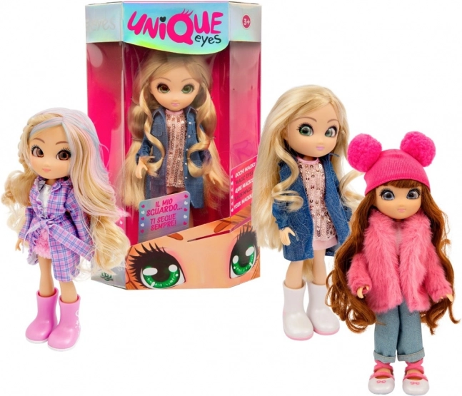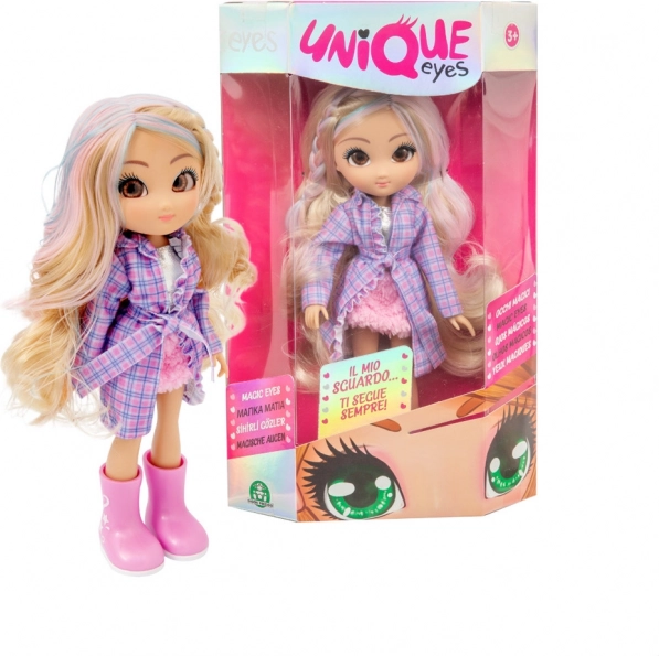 Fedezd fel a Unique Eyes baba varázsát – 25 cm magas, varázslatos szemekkel, amelyek követnek, hosszú, puha hajjal és divatos öltözettel és cipővel. 3 különböző változatban kapható, ideális 3 éves kortól.