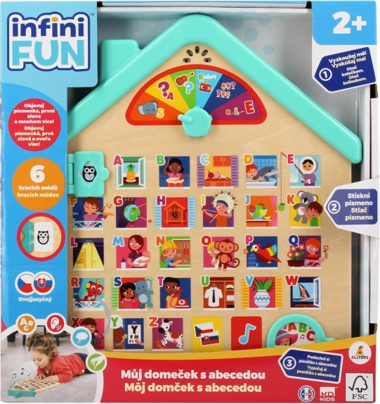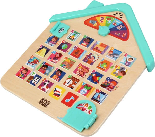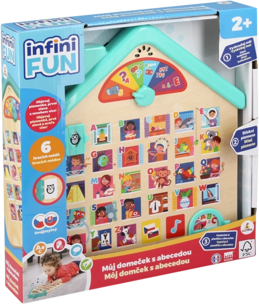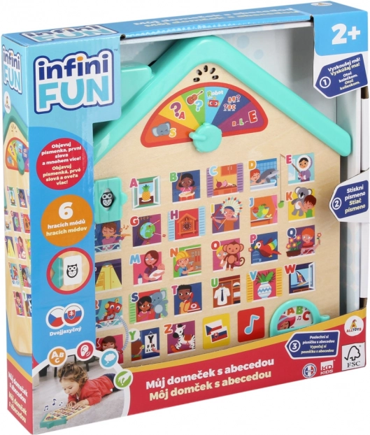 Ez az oktató fa házikó játékos módon ismerteti meg a gyerekeket az ábécével és az alapvető szavakkal. A cseh és szlovák nyelvű hangutasításoknak köszönhetően a kicsik könnyen eligazodnak, felfedezik a betűket és vidám képekhez párosítják őket. Az elemmel működő elektronikus funkciók hangokat, dallamokat és a tanulás örömét nyújtják.