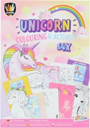 Könyv tele kifestőkkel és feladatokkal egyszarvú motívumokkal, amely szórakozást nyújt rajzolással, színezéssel és matricák ragasztásával a 64 oldalon.