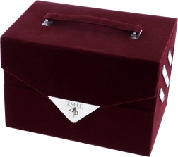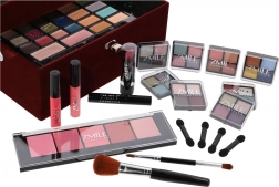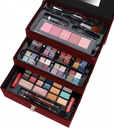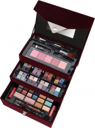 Velvety Beauty Case bársony sminkkészlet – sötétbordó bársony – összesen 74 darab tartozék. Tartalma: 32× szemhéjpúder 4 kompakt kazettában, 5× pirosító, 3× szemöldökpúder, 1× szemöldökviasz, 4× krémes szemhéjfesték, 4× csillámos krém, 2× szemhéjalap, 8× korrektor, 2× ajakfény, 1× rúzs, 1× szempillaspirál, 1× kétvégű szemceruza, 1× kétvégű ajakceruza, 1× pirosítóecset, 1× kétvégű szemhéjpúder ecset, 4× kétvégű applikátor, 1× beépített tükör. Bőrgyógyászatilag tesztelt, megfelel a szigorú EU-szabványoknak.
