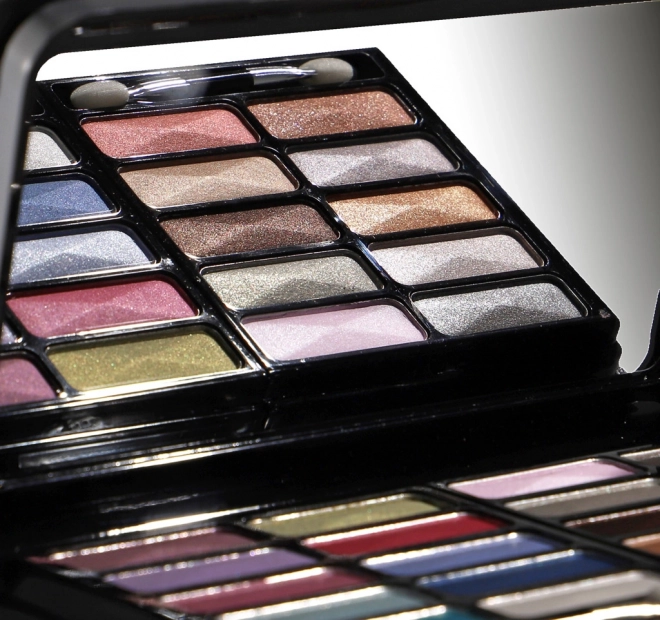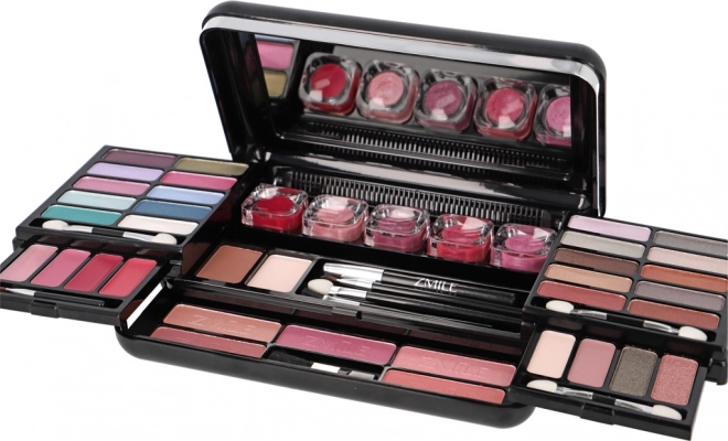 Elegáns fekete tok tükörrel, amely teljes készletet rejt a szem-, arc- és ajaksminkhez – ideális utazáshoz és mindennapi használatra.