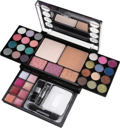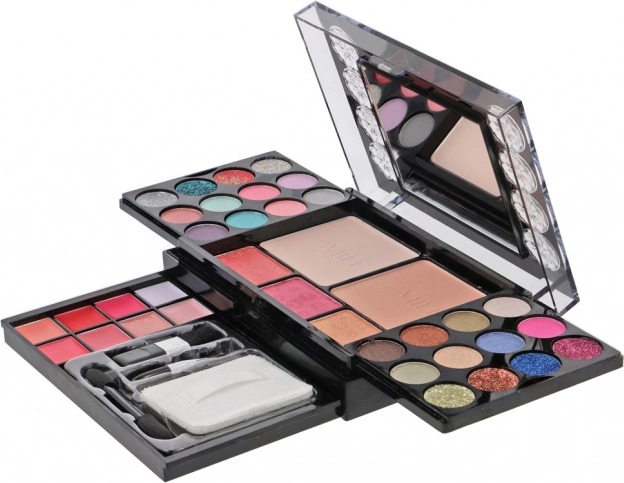 - 16× szemhéjpúder, 8× krémes ajakfény, 8× csillámos krém, 2× púder, 1× applikátor/ecset (3 az 1-ben), beépített tükör