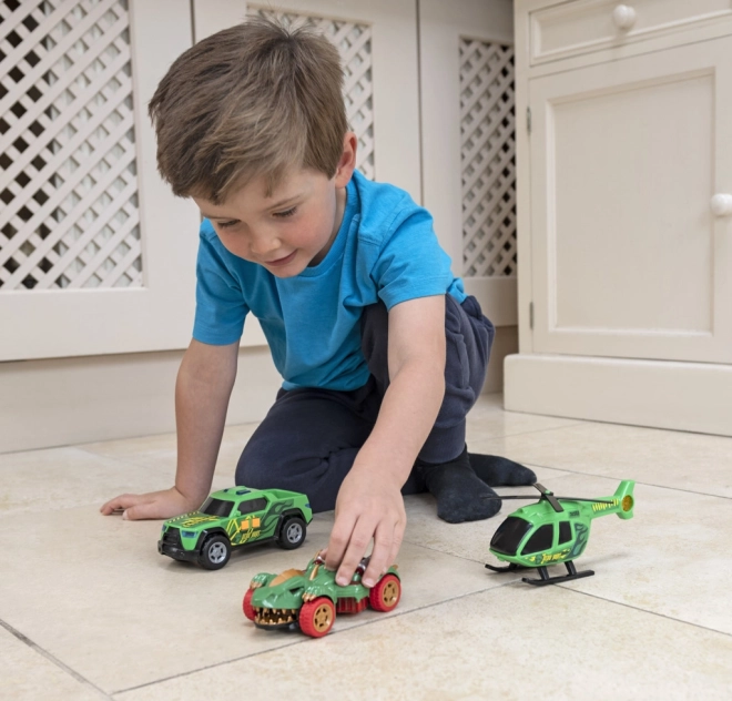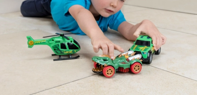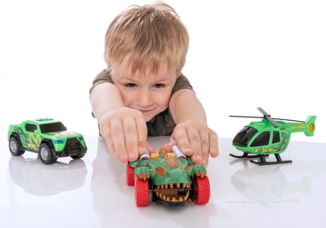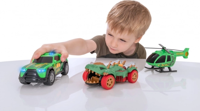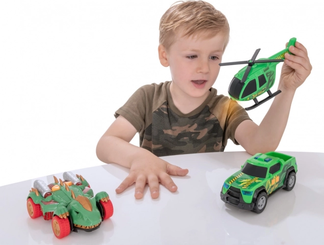 A szett része továbbá a Dino Vadász helikopter kézzel forgatható rotorszerkezetekkel a bonyolult légi vadászatokhoz, valamint a pickup vészjelző szirénákkal és fényekkel a valósághű mentési küldetésekhez.