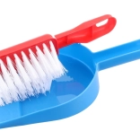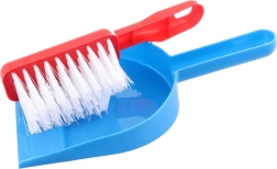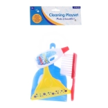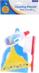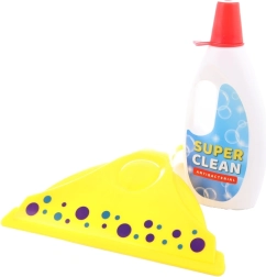 A kis háziasszonyoknak szánt takarítókészlet tartalmaz – lapátot, seprűt, ablaktörlőt, szivacsokat és mosószert.