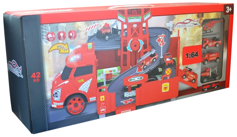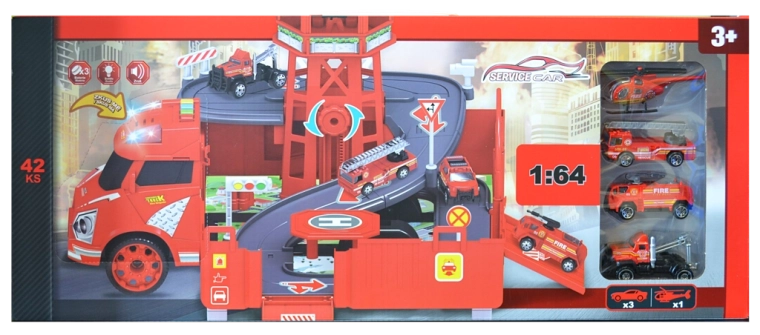 Tűzoltóállomás garázs tartozékokkal (készlet). A garázs mérete összeállítás után: 46,5 × 49 × 29 cm. Gombok hang- és fényhatásokhoz, szabadonfutás, „PRÓBÁLJ KI” funkció. A PRÓBÁLJ KI funkció aktiválása: Távolítsa el a biztosítékot az elemrekeszből, amely az autó fülkéjén található, majd próbálja ki a funkciókat a fülke tetején elhelyezett gombok megnyomásával. A készlet tartalma: tűzoltóautó/garázs 2 az 1-ben (átalakítási funkció autóból garázzsá és vissza), 1:64 méretarányú fém kisautó (6 db) és helikopter.