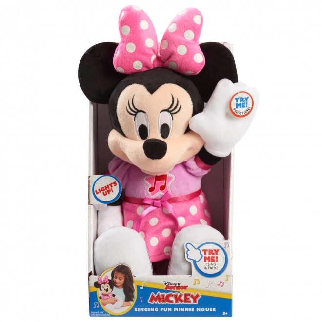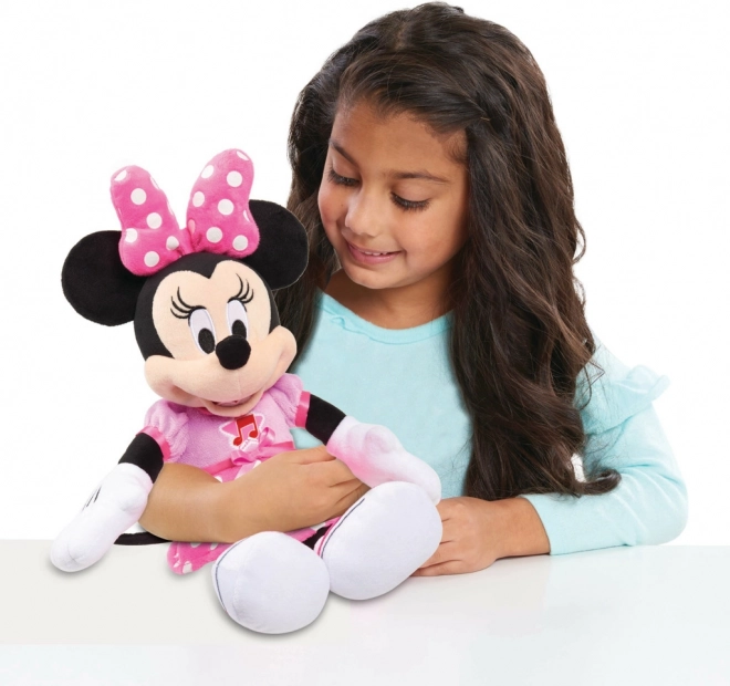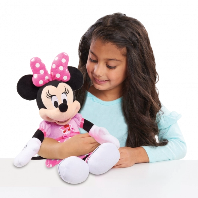 A plüss Minnie puha anyagokból készült, ami ideális ölelgetésre és biztonságos játékra a legkisebb rajongók számára.