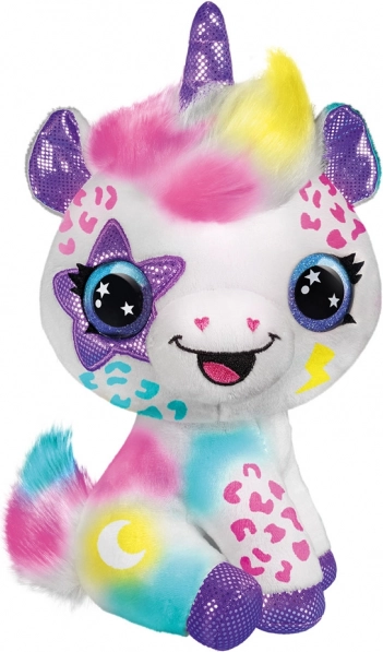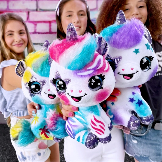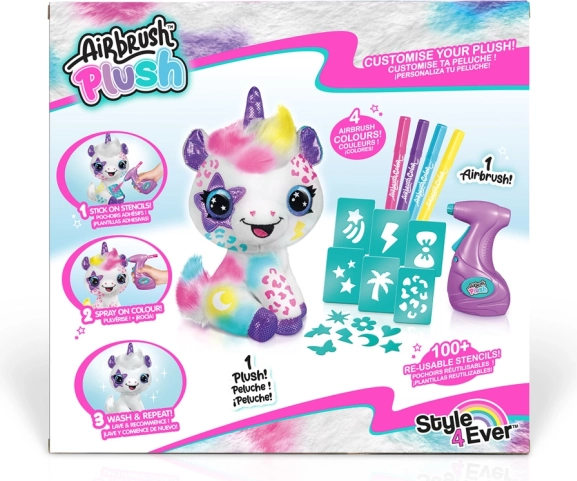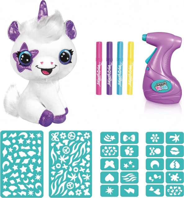 Változtasd a fehér plüss unikornist egyedi műalkotássá. Az egyszerű airbrush eszközzel és az öntapadó sablonokkal csillagokat, szívecskéket és színátmeneteket készíthetsz. Ha változást szeretnél, elég leöblíteni vagy kimosni hideg vízben, és újra alkothatsz.