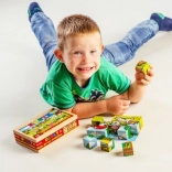A kockák praktikus fa dobozban vannak tárolva, amelynek méretei 20 x 13 x 5,2 cm. Az egész készlet 15 darabot tartalmaz, és 12 hónapos kortól ajánlott.
