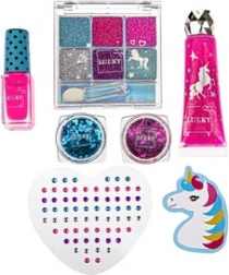 Ragyogtasd fel a gyerekek fantáziáját a LUKKY gyerek sminkkészlettel unikornis témában. A csomagban találsz csillogó zseléket, ízesített ajakfényt, lehúzható körömlakkot, csillámos szemhéjfestéket applikátorral, „drágakő” matricákat és körömreszelőt – tökéletes kreatív, játékos szórakozáshoz 3 éves kortól.
