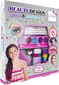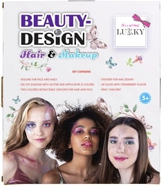 Fedezd fel a szépség világát a játékos Lukky Beauty Design Hair & Make‑up készlettel, amelyet kifejezetten gyerekeknek terveztek. A csomagban mindent megtalálsz az egyszerű és biztonságos szépítkezéshez: csillogó krémes szemfestéket applikátorral, epres ajakfényt, színes hajkrétát, körömmatricákat és ragyogó „drágakő” arcmatricákat. Egy cuki, unikornisos gyűrű sem hiányzik.