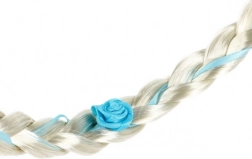 Az elegáns, szőke copf világoskék szalaggal és virágokkal átszőve finomságot és mesés bájt kölcsönöz a jelmeznek.