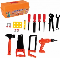- 34 darabos készlet: fúró, csavarhúzó, fűrész, villáskulcs, kalapács, fogó és különféle kötőelemek.