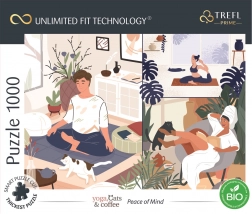Fedezze fel a relaxációt a TREFL UFT Yoga, Cats & Coffee kirakóval, amely az otthoni harmóniát okos megoldásokkal ötvözi. Az egyedülálló Unlimited Fit Technology lehetővé teszi az azonos sorozat motívumainak összekapcsolását, így korlátok nélkül alkothat saját kollázsokat.