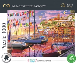 Fedezze fel a végtelen lehetőségek kirakóját a Trefl UFT Vacay Time: nyári este (1000 darab) készlettel. A Unlimited Fit Technology révén több motívumot is összekapcsolhat egy nagy kollázzsá. Prémium kék karton, egyedi formájú elemek és erős illeszkedés várja, amely lehetővé teszi a kész kép könnyű mozgatását. Ráadásul műanyagmentes, környezetbarát csomagolásban.