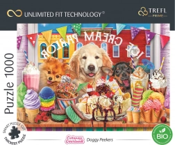A Trefl Unlimited Fit Technology (UFT) új dimenziót ad a kirakózásnak: a sorozat egyes motívumai szabadon összekapcsolhatók, így nagy puzzle kollázsok hozhatók létre korlátok nélkül. A cukrászda előtt várakozó, aranyos kutyusok motívuma elnyeri az állatbarátok és az igényes dizájn kedvelőinek tetszését.