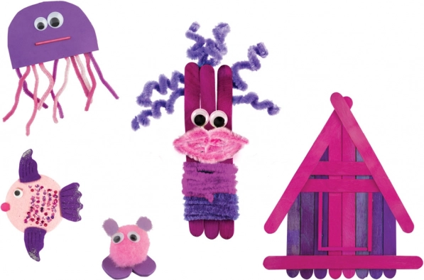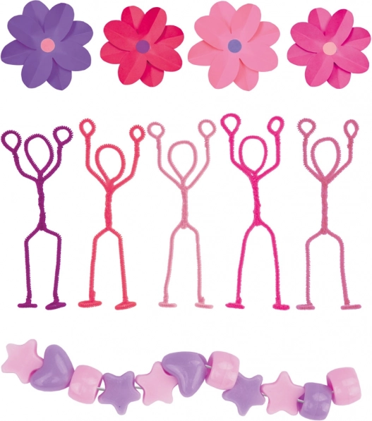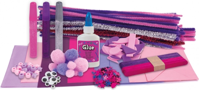 Zseníliadrótok, pomponok, hab formák, gyöngyök, öntapadós szemek, valamint csillámos és klasszikus ragasztó – számtalan kézműves projekthez ideális kombináció.