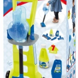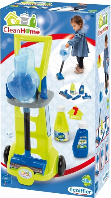 Az Ecoiffier sorozatba tartozó takarítókocsi rúdporszívóval és háromféle fejjel, két tisztítószerrel, valamint kétkerekű kocsival van felszerelve, amely megkönnyíti a teljes készlet áthelyezését bárhová.