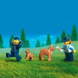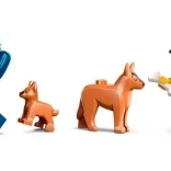 Két rendőr minifigura, egy kutya és egy kölyök figura, plusz kefe, zseblámpa, lapát és jutalomfalatok – minden adott az életteli kutyavezető szerepjátékhoz.