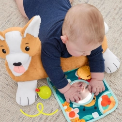 A cuki kutya formájú pocakpárna három különböző játéklehetőséget és fejlődési lehetőséget kínál. Ideális pocakon való játékra, ülésre és fantázia alapú játékra. A párna része egy zörgős panel és 3 interaktív játék, amelyek segítenek a motoros képességek fejlesztésében és serkentik a látás, hallás és érintés érzékszerveit.