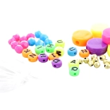 Különböző formájú és színű gyöngyök, beleértve a betűseket is, rugalmas zsinórok
