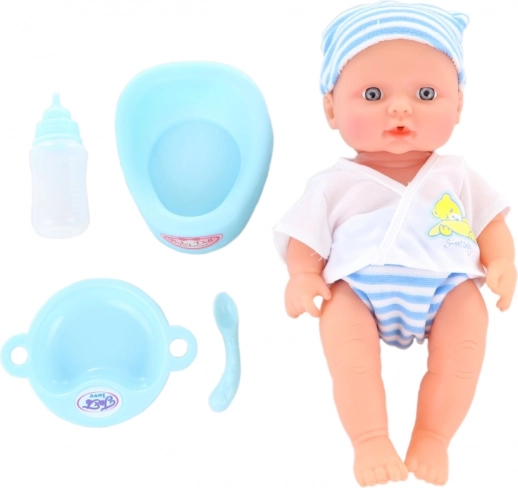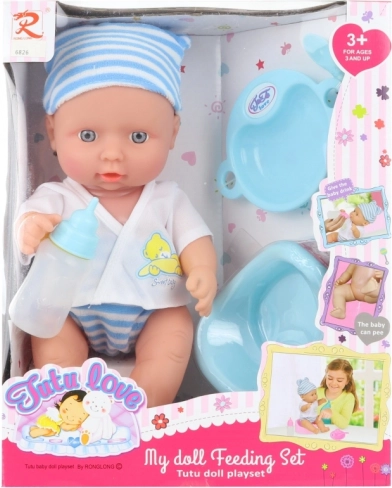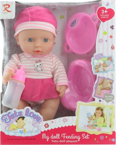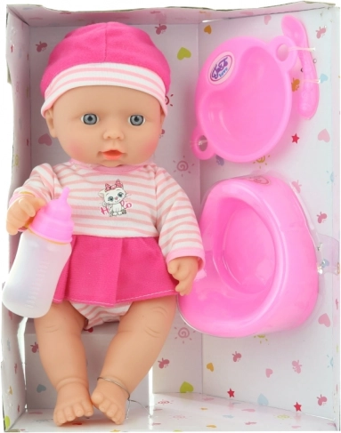 A készlet része a cumisüveg, tányér, kanál és bili, így a gyerekek külön vásárlás nélkül gyakorolhatják az etetést és a higiéniát.