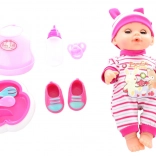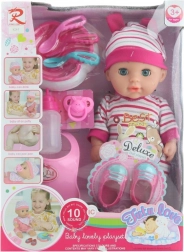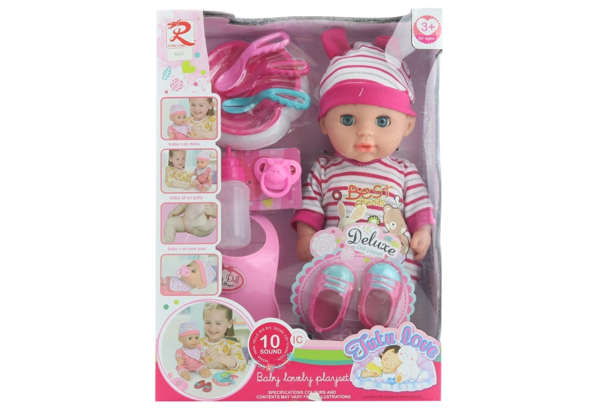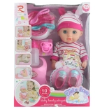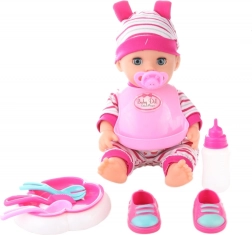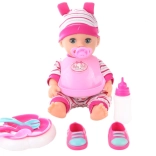 A 30 cm-es, aranyos baba órákra elegendő szórakozást és gondoskodást kínál. Elemmel működve realista hangokat ad ki, és a pisilő funkciónak köszönhetően a gyerekek valósághűen utánozhatják a babáról való gondoskodást. A csomagban praktikus kiegészítők találhatók, mint cipőcskék, előke, cumisüveg és tányér – ideális szerepjátékhoz és a finommotorika fejlesztéséhez.